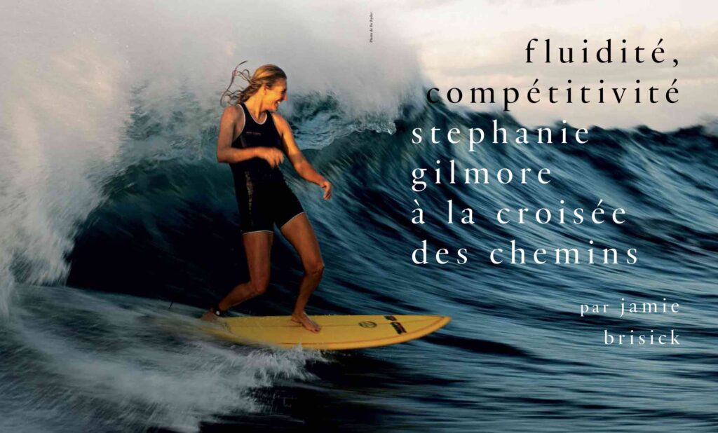 - Stéphanie Gilmore est connue pour ses 8 titres mondiaux et l’élégance de son style fluide. Mais l’Australienne est discrète sur elle-même. Jamie Brisick, lui-même ex-pro devenu écrivain journaliste, est allé à sa rencontre pour Surfer’s Journal. Désormais free surfeuse, Gilmore se dévoile et raconte comment elle veille à maintenir son surf sur une voie qui n’est plus compétitive mais pas moins radicale. Un article de 16 pages qui dresse le portrait vivifiant et intime de la surfeuse la plus charismatique et légendaire du XXIe siècle.