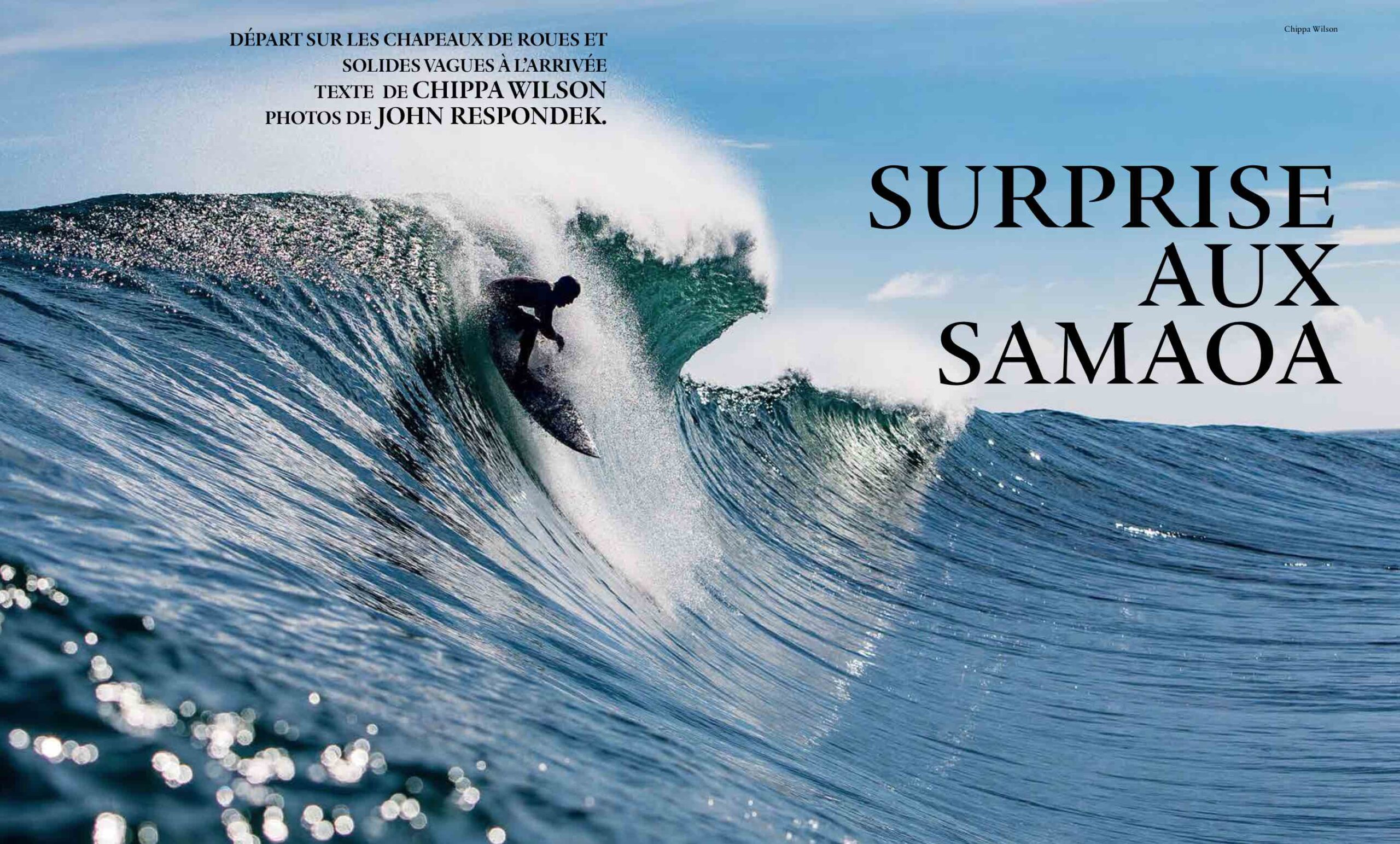 - Les îles Samoa sont lointaines, mais pas tant que cela quand on habite l’Australie. Le photographe John Respondek (SJ 128) et le surfeur Chippa Wilson flairent l’arrivée d’une houle sur l’archipel polynésien, battent le rappel d’autres gars comme Dion Agius et, 48 h plus tard, l’équipée se retrouve sur place. Surf engagé audacieux et photos superbes résultent du bon pari !