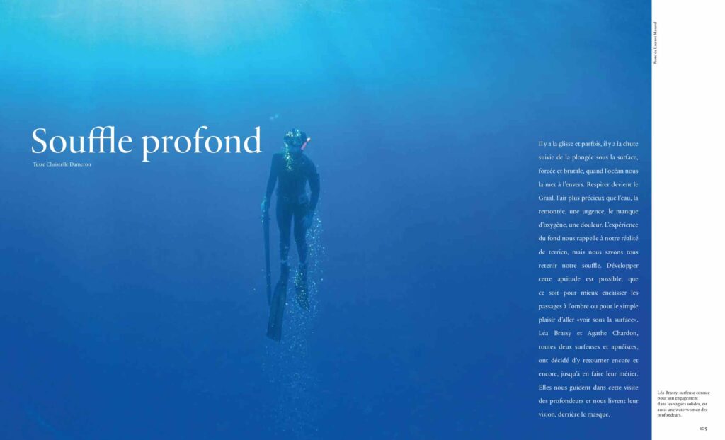 - Le bouillon des vagues mérite en contrepartie le ravissement des profondeurs. Plongée en apnée avec Léa Brassy (SJ 138 et 151) et Agathe Chardon, surfeuse aussi, qui ont fait de la côte bretonne leur refuge sous-marin.